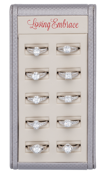We have been using the Loving Embrace program for several years and are very pleased. With 12 curvatures and many different styles, practically any engagement ring can be easily matched. The workmanship and service are exceptional. An added benefit we've found is that joining 2 of the curved bands simplifies building insert rings.
