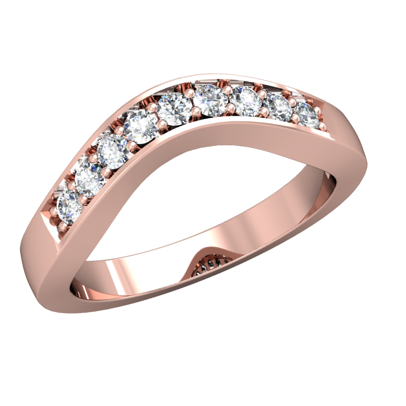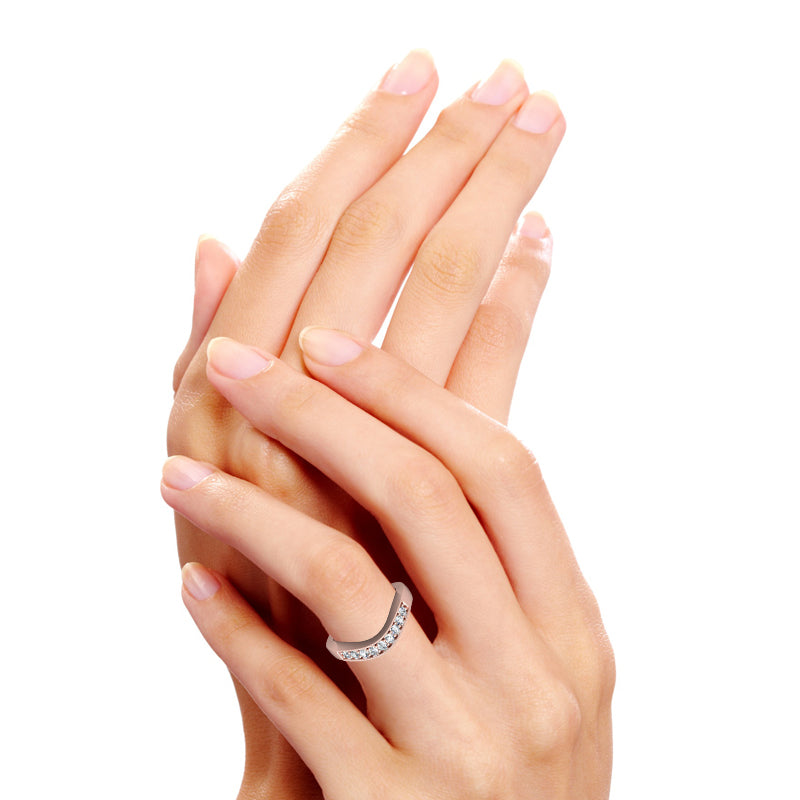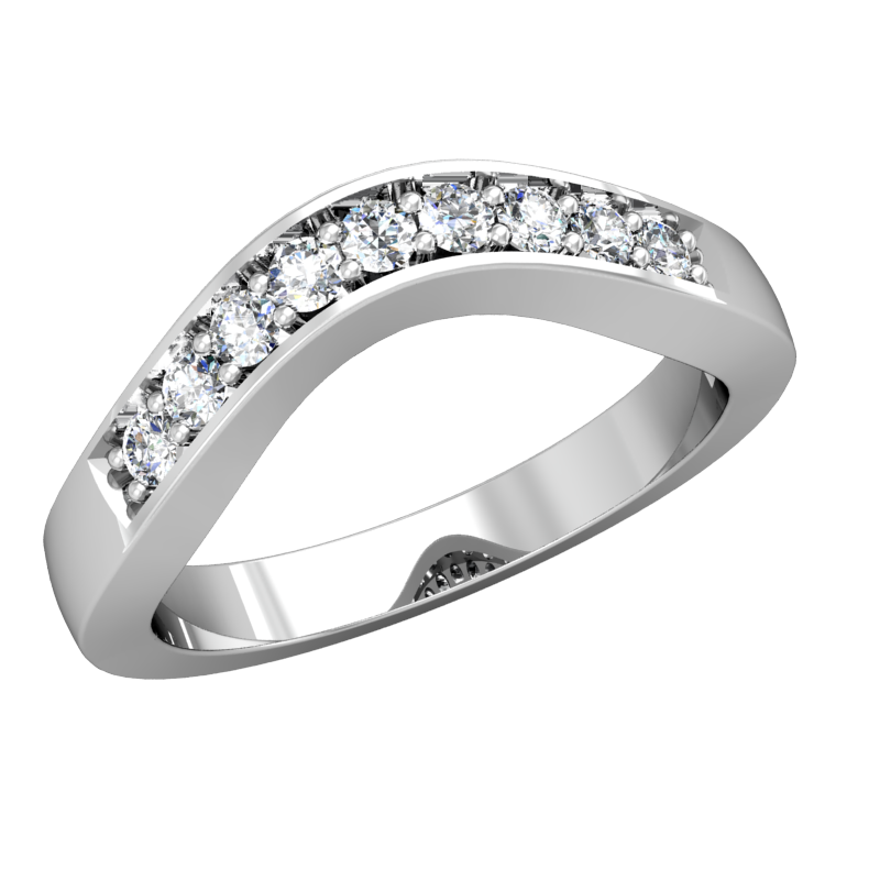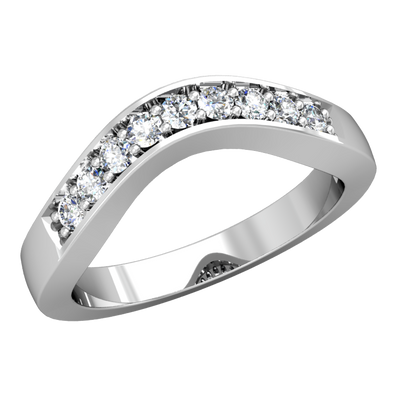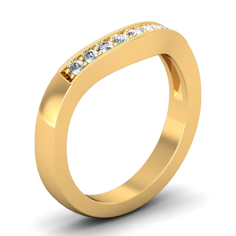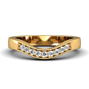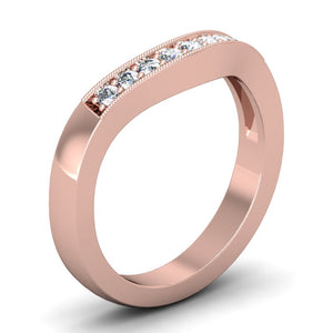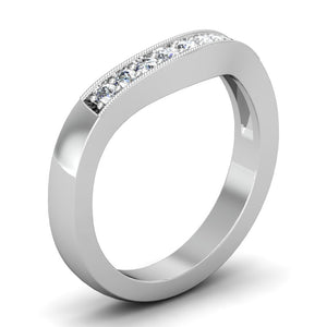 This contoured wedding band features 9 round-cut diamonds and a gorgeous hand finished milgrain edge.The pave setting style is perfect to accent any designer engagement ring, classic solitaire, antique or three stone ring. Matching your custom curve # allows this gentle curve to nestle perfectly with your engagement ring.