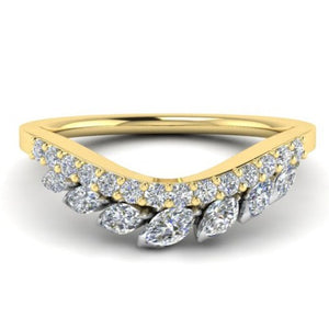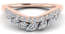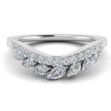 The FWB-762 band combines crisp white marquis shaped fancy diamonds with flawless round diamonds delivering a unique and luxurious band that contours around most engagement rings. The FWB-762 band comes standard in our most popular curve #7, however you may order the use of our patented sizing tool which will allow you to special order in one of twelve available contours. Each band is is custom-made to fit your contour size and ring size ensuring the perfect fit!